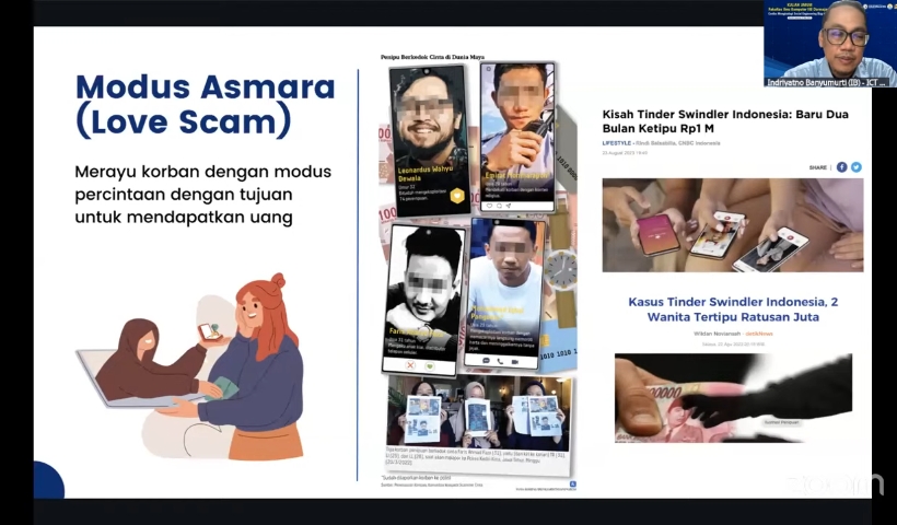 Dalam paparannya Indriyatno Banyumurti mengulas kejahatan di dunia digital bagaimana pelaku memasuki device baik handphone ataupun komputer saat berselancar. “Mereka menscrolling ketika kita sedang membuka beberapa aplikasi seperti mobile banking dan lainnya yang berkaitan dengan data pribadi kita. Ini bagian dari malware yang menyisipi ke handphone,” ujarnya.