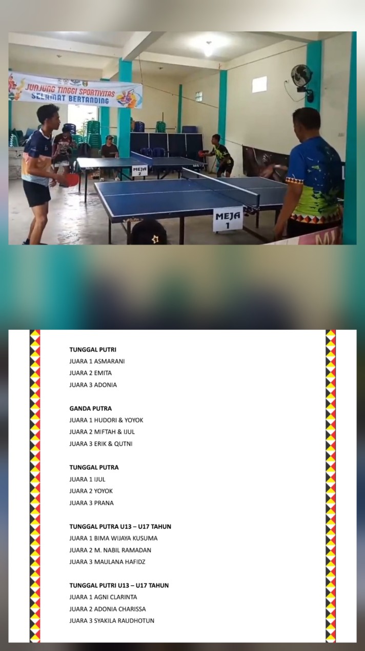 Hasil akhir gelaran pertandingan tenis meja usia 13 – 17 PORKAB 2025 yaitu untuk katagori tunggal putera juara 1 Bima Wijaya Kusuma dari Kecamatan Semaka, juara 2 M. Nabil Ramadhan dari Kecamatan Talangpadang dan juara 3 Maulana Hafidz dari Kecamatan Gisting.